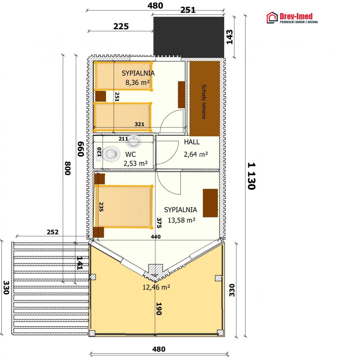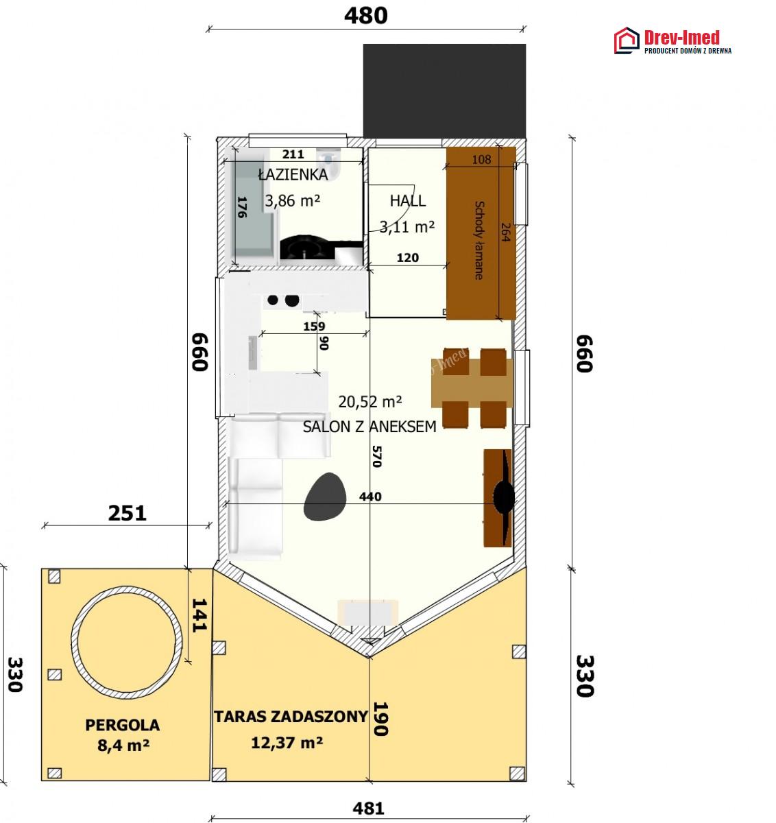 Dom mieszkalny jest wykonany z drewna świerkowego, sezonowanego , suszonego, sezonowane 6 lat, heblowanego czterostronnie i impregnowanego przeciw grzybicznie oraz ogniu. Budowany jest w technologi szkieletu drewnianego, którego konstrukcja jest opatentowana i wykonywana tylko przez naszą firmę już od 40 lat . Konstrukcja ze względu na liczne połączenia ciesielskie i rozwiązania konstrukcyjne stanowi bryłę o bardzo mocnej i stabilnej konstrukcji.