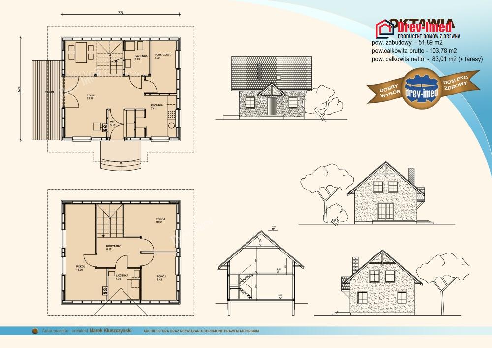 Dom mieszkalny jest wykonany z drewna świerkowego lub na zamówienie z drewna modrzewiowego. Jest bardzo dobrze ocieplony wełną Gullfiber. Od wewnątrz może być wykończony suchymi tynkami lub drewnem. Od zewnątrz posiada elewacje drewnianą lub termomur różnej grubości plus dodatkowe ocieplenie uzyskując statut domu Pasywnego.